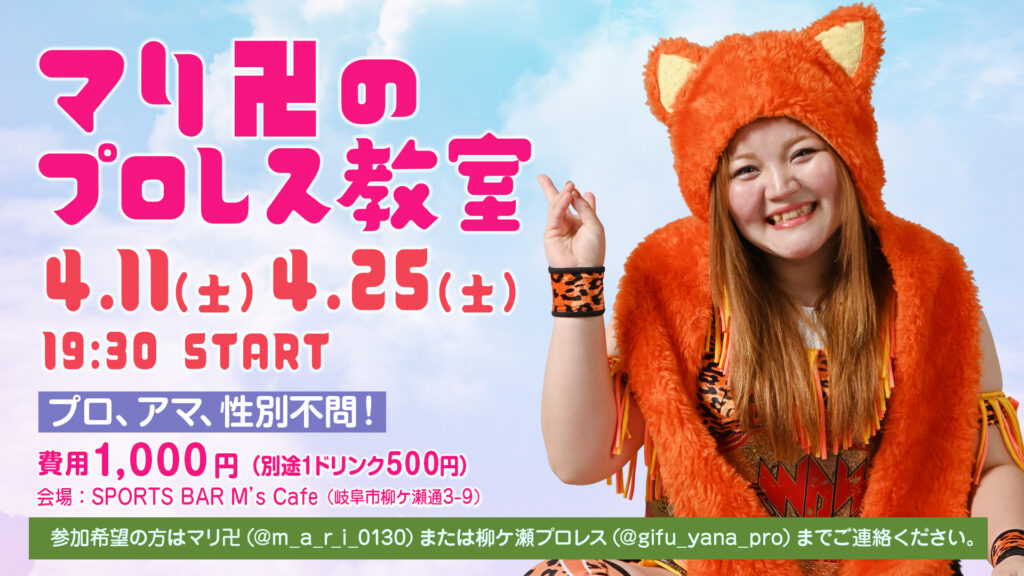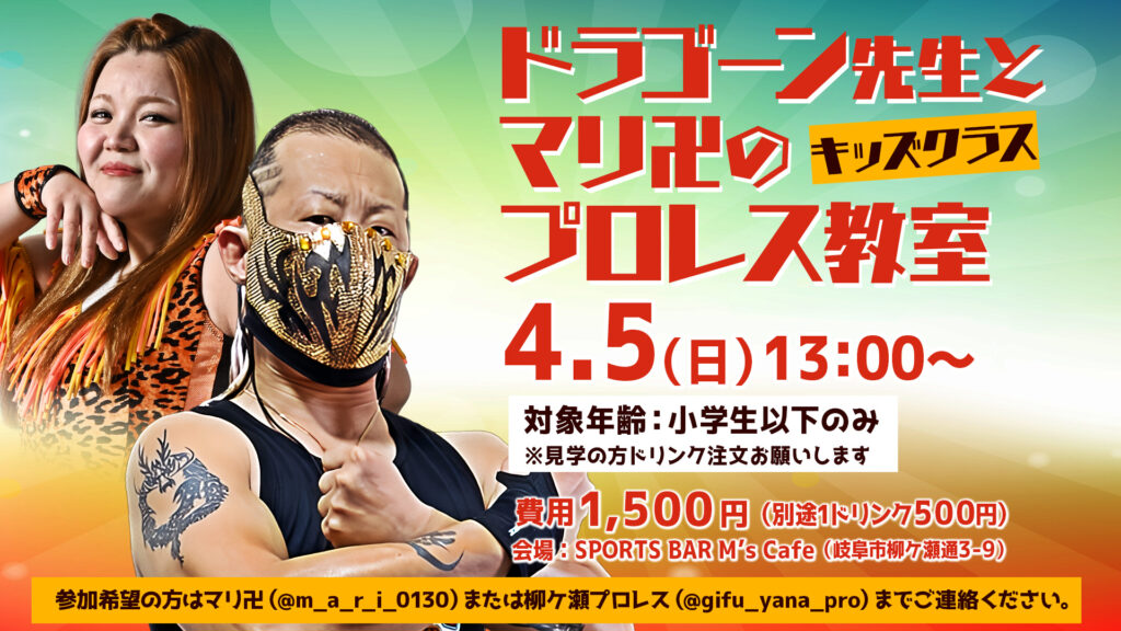 チームでらのドラゴーン選手をゲスト講師にお迎えして、小学生以下の方を対象にしたプロレス教室を開催します。基礎体力重視のマリ卍教室とはまた違った形のプロレス教室です。ぜひご参加ください。