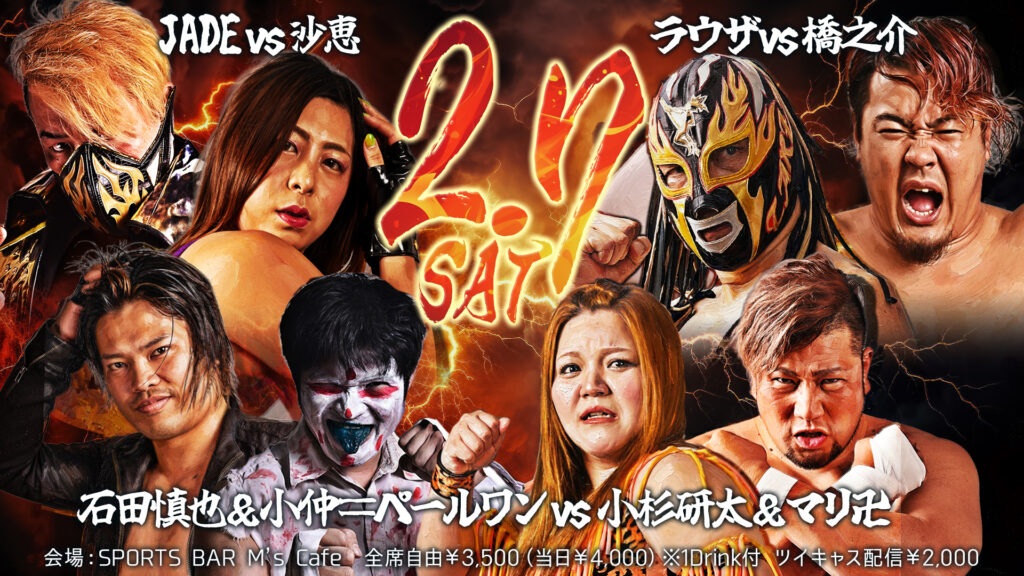 2026年2月7日「回山冬魁」 会場:SPORTS BAR M's Cafe(岐阜市柳ケ瀬通3-9)18:30開場/19:30試合開始全席自由¥3,500(当日券¥4,000) 第1試合は、沙恵vsJADEのシングル対決。12月大会で暴君&性悪女タッグを結成したものの、誤爆に次ぐ誤爆で水噴射を... -