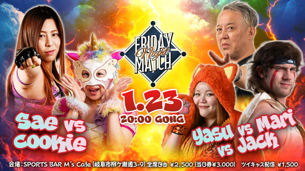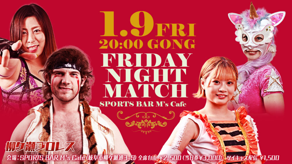 2026年1月9日「フライデーナイトマッチ」 会場:SPORTS BAR M's Cafe(岐阜市柳ケ瀬通3-9)全席自由¥2,500(当日券¥3,000) 新年明けましておめでとうございます。柳ケ瀬プロレスの定期開催興行「フライデーナイトマッチ」は、1月9日(金)20:00スタ... -