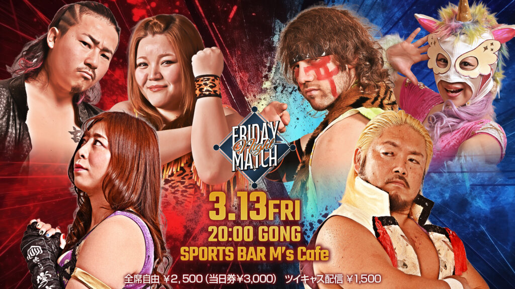 2026年3月13日「フライデーナイトマッチ」 会場:SPORTS BAR M's Cafe(岐阜市柳ケ瀬通3-9)全席自由¥2,500(当日券¥3,000) 第1試合には、影山道雄が参戦!沙恵とシングルマッチで激突する。最近はマリ卍との関係性が取り沙汰されることが多い?影... -