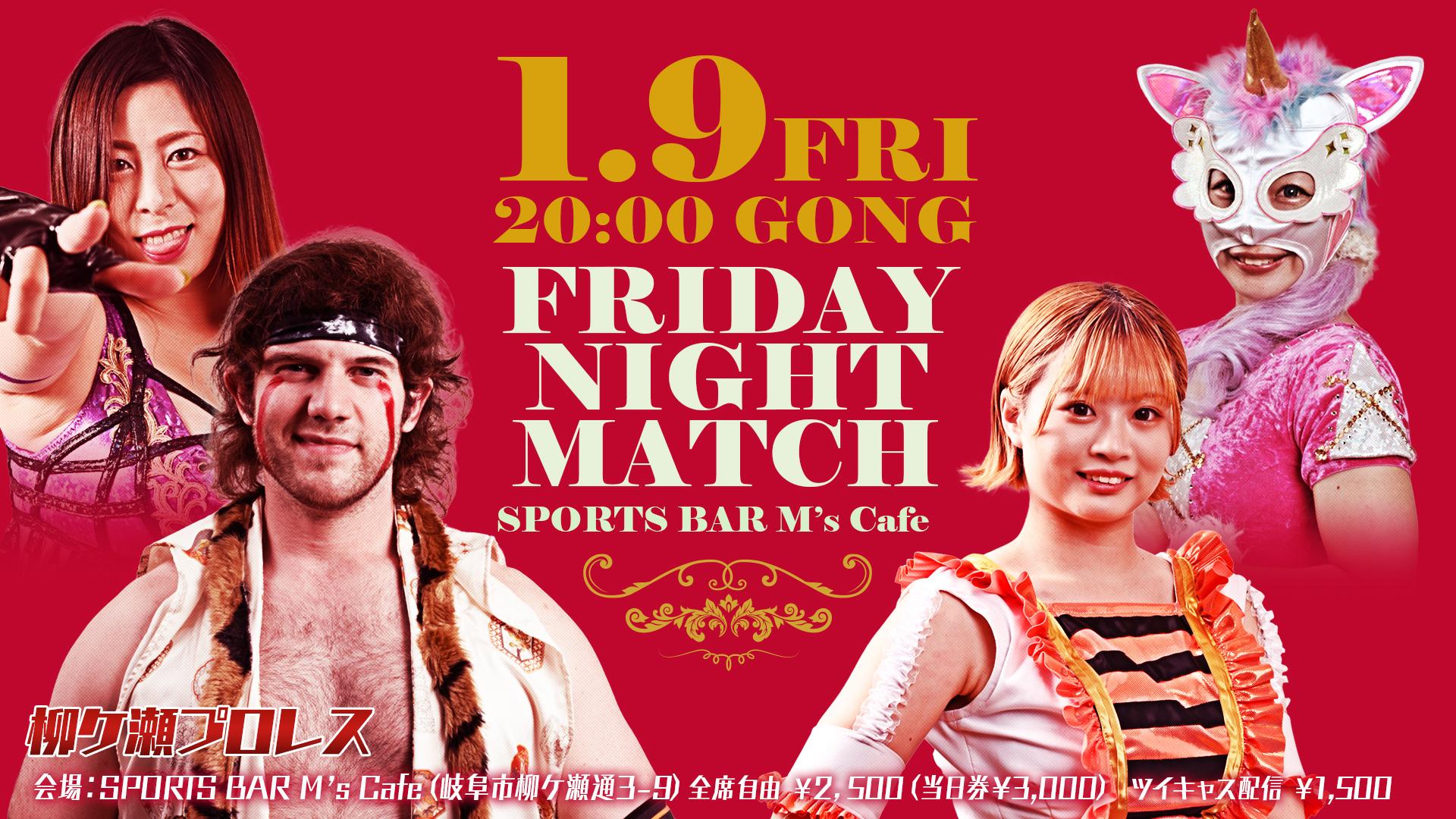 新年明けましておめでとうございます。柳ケ瀬プロレスの定期開催興行「フライデーナイトマッチ」は、1月9日(金)20:00スタート。今年も熱い戦いを皆様にお届け致します。
