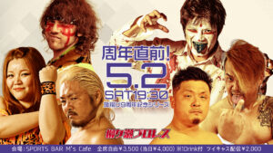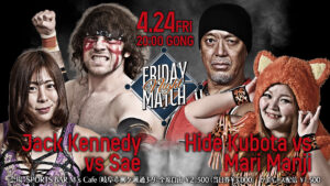 試合結果(2026年4月24日) 2026 4/27 フライデーナイトマッチ 2026年4月10日 会場:SPORTS BAR M’s Cafe 20:00試合開始 第1試合 シングルマッチ 20分1本勝負 〇ジャック・ケネディ VS 10分46秒 片エビ固め 沙 恵● ※ローリングラリアット メインイベント シングルマッチ 20分1本勝負 〇ヒデ久保田 VS 16分14秒 逆エビ固め マリ卍● フライデーナイトマッチ 試合結果(2026年) ジャック・ケネディ ヒデ久保田 マリ卍 沙恵 大会情報 2026年4月24日「フライデーナイトマッチ」 大会情報 2026年5月2日「旗揚げ9周年記念シリーズ」