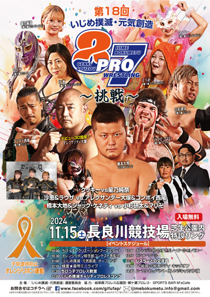 第18回 いじめ撲滅・元気創造チャリティプロレス 2025年11月15日 会場:長良川競技場 芝生広場特設リング 12:00試合開始 第1試合 シングルマッチ 20分1本勝負 〇クッキー VS 8分9秒 シュガークラッチ 星乃純奈● 第2試合 タッグマッチ 20分1本勝...