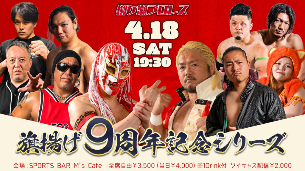 旗揚げ9周年記念シリーズ 2026年4月18日 会場:SPORTS BAR M's Cafe 20:00試合開始 第0試合 デビュー査定エキシビション(5分) △ヤス久保田 VS 時間切れ引き分け 藤村 匠△ ※ヤス久保田、そして観客の皆さんの査定により、藤村匠の5月4日「旗揚げ9...